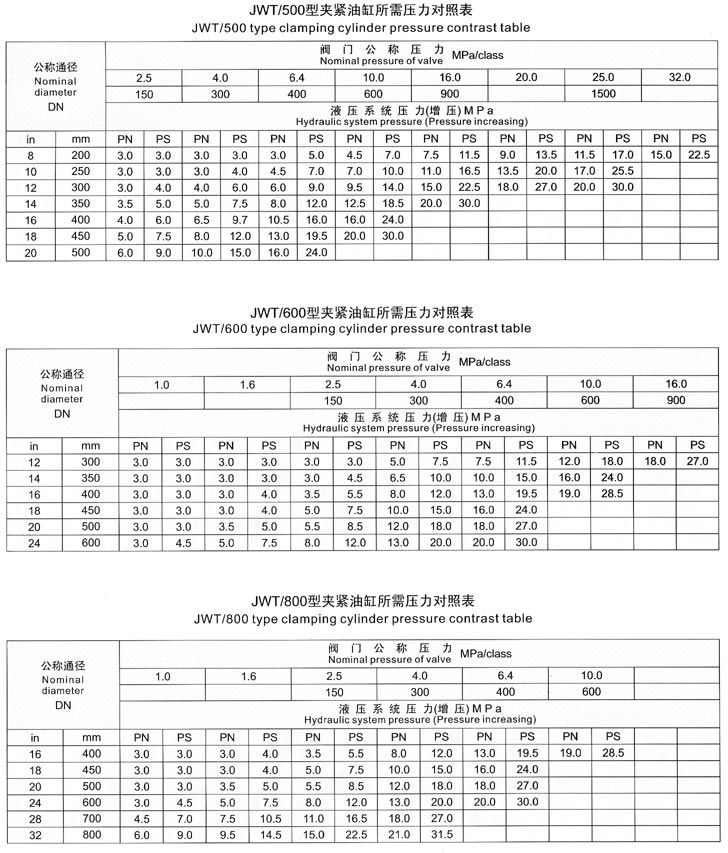 根據(jù)被試閥門公稱通徑和公稱壓力,調(diào)節(jié)電接點壓力表和被試閥門壓力相同。參照《壓緊油缸所需壓力對照表》將壓緊油缸壓力增壓到所需壓力要求。 (注:增壓按鈕可要多次點動,每次按動相隔時間需在5-10秒鐘左右)。