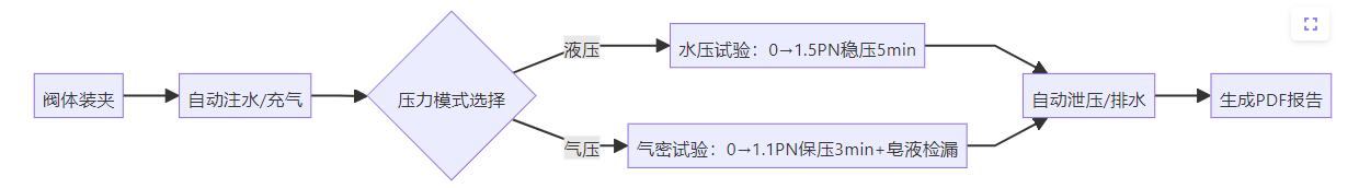 閥體裝夾 自動(dòng)注水/充氣 壓力模式選擇 水壓試驗(yàn):0→1.5PN穩(wěn)壓5min 氣密試驗(yàn):0→1.1PN保壓3min+皂液檢漏 自動(dòng)泄壓/排水 生成PDF報(bào)告